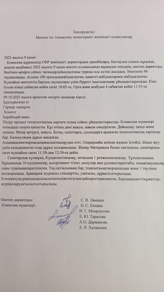 Мектептегі тамақтану мониторингі жөніндегі комиссияның 2025 жылғы қазан айындағы тексеру актісі.