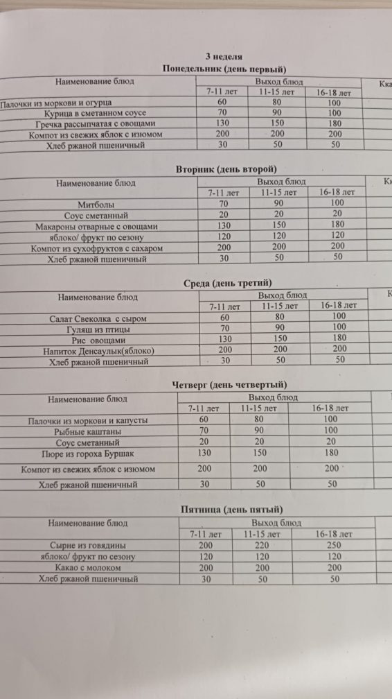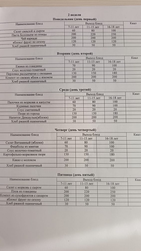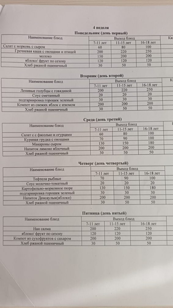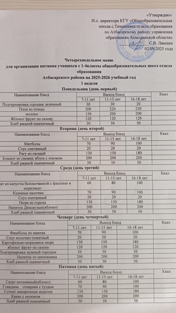 2025-2026 оқу жылының 1-4-сыныбынан бастап жалпы білім беру есебінен тамақтану мәзірі.